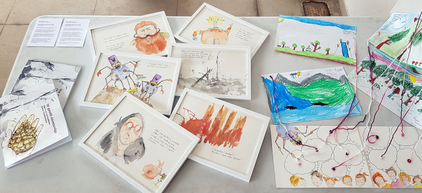 My final work was a 50 page hand-drawn fairy tail based on the stories and testimonies collected from the locals and it included a foldout with the drawings of the young kids: